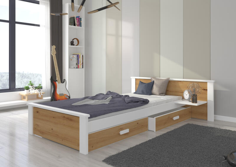 Egy egyszemélyes ALDEX SHELF ágy egyszerű formája remekül illeszkedik egy tinédzser szobájának belső terébe. Ez a modell polccal van felszerelve, ami ideális helyet biztosít éjjeli lámpának vagy kedvenc könyvének. Két tágas és praktikus fiók is része az ágynak, amelyek tökéletesek ágynemű tárolására. A szett tartalmazza a strapabíró, merev lécű ágyrácsot is, valamint egy 8 cm vastag memóriahabos matracot. Az ágykeret három rétegű lakkbevonattal van ellátva, ami biztosítja a mechanikai sérülések és különböző foltok elleni védelmet.