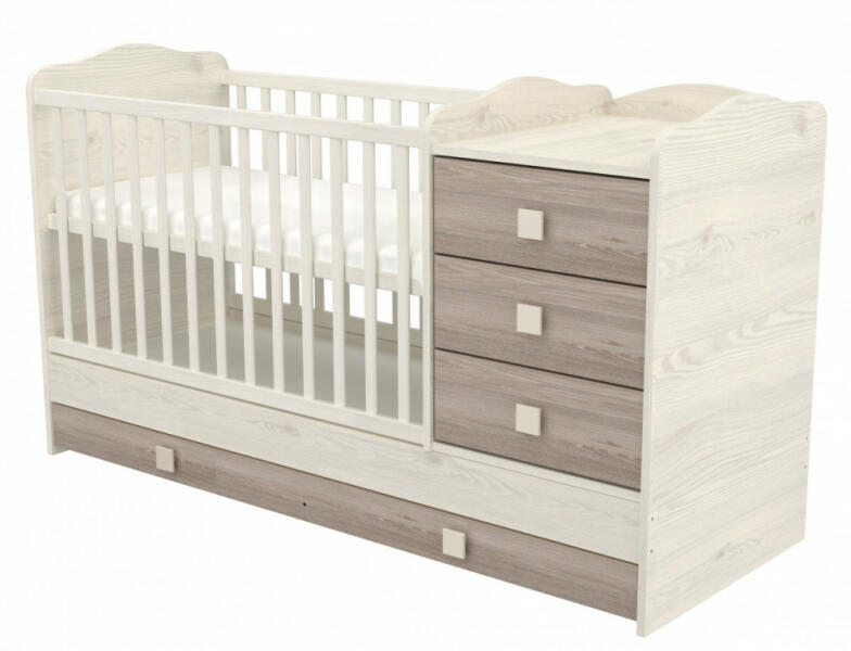 Kombinált kiságyunk megfelelő választás kisebb babaszobák berendezése során, hiszen egyszerre kombinálja a klasszikus rácsos kiságyat a pelenkázószekrénnyel, ám jóval kisebb helyet elfoglalva, mint a két bútordarab külön-külön. A kiságy fekvőfelülete 3 magassági fokozatban állítható. Míg újszülött-, illetve pár hónapos korában a legfelső pozíció kényelmes hozzáférést biztosít az anyukának, addig a gyermek növekedésének megfelelően a fekvőfelület a későbbiekben további két fokozattal lejjebb helyezhető. Rácsaiból 2 oldalpálca könnyen kivehető, ennek köszönhetően, ha gyermeke már önállóbb, egyedül ki-be járkálhat, így nem szükséges mindig kisegíteni őt onnan. Eközben mégis biztonságosabban alszik, mint egy sima heverőn, hiszen így a rácsoknak köszönhetően nem gurul le. A pelenkázószekrény jobb és bal oldalra egyaránt felszerelhető. A síneken futó ágyneműtartó pedig még praktikusabbá teszi a terméket, segítve a kényelmes tárolást. A kiságy rácsos-babaágyként körülbelül 3 éves korig (max. 15 kg), junior gyermekágyként pedig körülbelül 12 éves korig használható. A gyerekágy az oldalrácsok és a pelenkázószekrény eltávolítása után egy ifjúsági heverővé és egy éjjeli szekrénnyé alakítható. Az ágy könnyedén átalakítható, amihez nincs szükség pótalkatrészek megvásárlására, ezek a termékkel együtt járnak. A termék megfelel az Európai Unió és a Magyar Szabványügyi Testület által előírt szigorú szabványoknak. Méretek (magasság x szélesség x mélység)