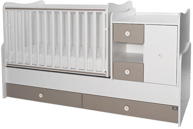 Lorelli Mini Max Kombi Kiságy: 3 az 1-ben megoldás a babaszobába! ?️ A Lorelli Mini Max kombi kiságy egy multifunkcionális bútordarab, amely újszülött kortól iskolás korig kiszolgálja gyermeked igényeit. Egyben babaágy, pelenkázó komód és ifjúsági ágy, így helytakarékos és pénztárcabarát megoldás. Főbb jellemzők:3 az 1-ben kialakítás: Babaágy, pelenkázó komód és ifjúsági ágy egyben. Hosszú távú használat: Újszülött kortól iskolás korig használható. Bölcső funkció: A kiságy oldalirányba ringatható, a nyugodt alvásért. ? Állítható fekvőfelület: Három magasságban állítható a fekvőfelület a baba növekedéséhez igazodva. Praktikus pelenkázó komód: Jobb és bal oldalra is felszerelhető, 3 fiókkal és egy ajtós polcos elrendezéssel a babaholmik tárolására. ? Nagy tárolókapacitás: 2 nagyméretű ágyneműtartó fiók a kiságy alatt. Biztonságos kialakítás: Lekerekített sarkok a sérülések elkerülése érdekében. Állítható oldalrács: Két magasságban állítható, és 2 eltávolítható elemmel rendelkezik, hogy a nagyobb gyerek önállóan ki-be tudjon mászni. Átalakíthatóság: Ifjúsági ággyá és éjjeliszekrénnyé alakítható. Műszaki adatok:Kiságy matrac mérete: 120x60 cm (a matrac nem tartozék) Kombi ágy mérete: 197x83x108 cm Ifjúsági ágy fekvőfelülete: 190x72 cm Pelenkázó komód mérete: 63x83x70 cm Ágyneműtartó mérete: 123x70x81 cm Súly: 140,5 kg Anyaga: 18 mm-es melamin forgácslap Fontos: A matrac és az ifjúsági ágyhoz tartozó ágyrács nem tartozék! A Lorelli Mini Max kombi kiságy megfelel az EN 71-3 Európai Biztonsági Szabványnak.