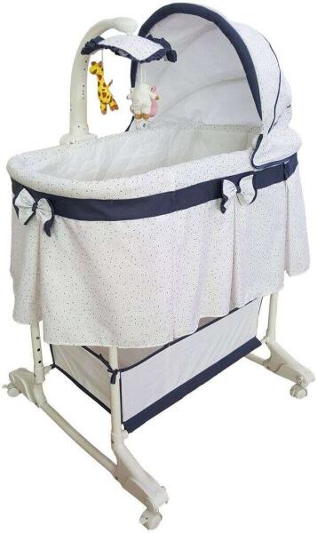 Milly Mally Sweet Melody 2 az 1-ben bölcső: Nyugodt álomba ringatás a babádnak ? A multifunkcionális Milly Mally Sweet Melody bölcső és kiságy egyben ideális a babák számára életük első napjaitól kezdve. A praktikus kerekeknek köszönhetően könnyen áthelyezhető, és egyszerűen átalakítható fix kisággyá felemeléssel és rögzítéssel. Mitől különleges? ✨Forgó játék plüssfigurákkal: Vidám állatok, nyugtató dallamok és éjszakai fény segítik az elalvást. ? Távirányító: Könnyedén vezérelheted a dallamokat és a fényt anélkül, hogy megzavarnád a szundikáló babát. ? Állítható magasság: 4 pozíció a baba és a szülők kényelméért. ↕️ Leengedhető oldalfal: Könnyű pelenkázás a baba felemelése nélkül. ? Puha matrac: Kényelmes és egészséges alvást biztosít. ☁️ Praktikus kosár: Hely a pelenkáknak és egyéb apróságoknak. ? Mosható huzat: Könnyű karbantartás és higiénia. ? Vibrációs funkció: Extra kényelem a babádnak. Technikai paraméterek:Paraméterek ÉrtékekHossz 87 cmSzélesség 47 cmMélység 27 cmMagasság (szabályozható) 135 cmMatrac mérete 79 cm x 41 cmA forgó játék tápellátása: 3 db C típusú elem (nem tartozék).