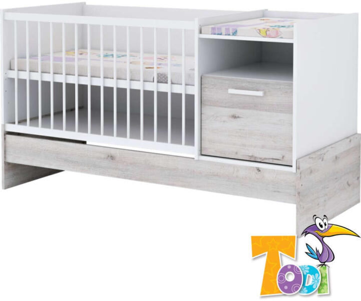 Todi Bee Babaágy Kombi - Fehérített Szürke Tölgy és Fehér: Tökéletes 2 az 1-ben megoldás ? Ez a gyönyörű Todi Bee babaágy kombi tökéletes választás a kisbabád számára, hiszen 2 éves korig babaágyként, 2-8 éves korig pedig juniorágyként is használható! A stílusos fehérített szürke tölgy és fehér színkombináció pedig bármilyen babaszobába remekül illeszkedik. ✨ Kényelmes és biztonságos: A fekvőrács három magasságban állítható, így mindig a baba korának és fejlődésének megfelelő magasságban lehet elhelyezni. Az egyik oldal teljes lap, a másik pedig 2 kivehető pálcával rendelkezik, így könnyen hozzáférhetsz a babához. Bükkfából készült, egészségre ártalmatlan, vizes bázisú lakkal kezelt oldalrács. 2 mm vastag PVC élzárás a tartósságért és a hosszú élettartamért. Praktikus átalakítás: A babaágy egyszerűen átalakítható ifjúsági heverővé, a komód pedig éjjeli szekrényként funkcionálhat. Nincs szükség extra alkatrészekre! Opcionálisan vásárolható két részes gurulós ágyneműtartó a kényelmes tárolásért. ? Méretek:Méret Méret (cm)Külső szélesség 177,3Külső magasság 99Külső mélység 76Matrac (babaágy) 120 x 70Matrac (heverő) 174 x 70Fontos: A matracot külön kell megvásárolni. A kombiágy terhelhetősége kiságyként 15 kg. Jobbos és balos kivitelben is kapható. Az oldalrács és bútortest színe eltérhet egymástól.