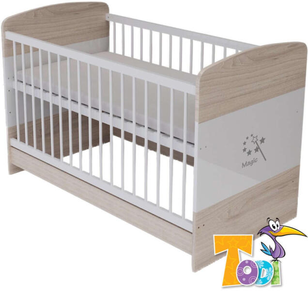 Todi Magic átalakítható kiságy (70x140 cm) - Szilfa/Fényes fehér: Tökéletes választás a babaszobába! ?️ A Todi Magic átalakítható kiságy egy elegáns és praktikus megoldás, amely a baba növekedésével együtt alakul. 2 éves korig babaágyként, majd 2-6 éves kor között junior ágyként használható. Főbb jellemzők és előnyök:Átalakítható kialakítás: Könnyedén alakítható babaágyból junior ággyá, így hosszú távú megoldást nyújt. Állítható fekvőfelület: A fekvőfelület magassága több fokozatban állítható, hogy a baba növekedéséhez igazodjon. Kivehető pálcák: Az oldalsó pálcák kivehetők, megkönnyítve a járni tudó baba ki- és bejutását. Prémium minőségű anyagok: A laminált bútorlapból készült alkatrészek élei 2 mm vastag PVC élzárással vannak ellátva a tartósság érdekében. Biztonságos felületkezelés: A gyerekágy felületkezelése tanúsítvánnyal rendelkező, bababarát, vízbázisú anyagokkal történik. Masszív fekvőrács: A matracot tartó fekvőrács bükkfa keretre épített nyír rétegelt lemezből készül. Elegáns design: A szupermatt felületű, fahatású bútortest és a magasfényű fehér front modern és stílusos megjelenést kölcsönöz. Méretek: Külső méret: szélesség: 144 cm x magasság: 92,6 cm x mélység: 76 cm Matrac mérete: 70 x 140 cm (A matrac nem tartozék!) A Todi Magic gyerekbútor megfelel az Európai Unió és a Magyar Szabványügyi Testület által előírt szigorú szabványoknak, így biztos lehetsz benne, hogy a babád biztonságban van. ?