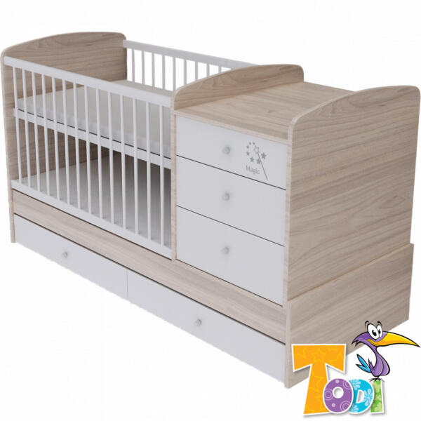 A Magic elegáns, klasszikus megjelenésű termékcsalád, amely szupermatt felületű, fahatású bútortesttel és magasfényű fehér fronttal rendelkezik. A maximális helykihasználást szem előtt tartva terveztük a Magic pelenkázóval kombinált gyerekágyunkat, mely 2 éves korig babaágyként, 2-8 éves kor között juniorágyként használható. A fekvőrács három magasságban állítható. A gyerekágy a rácsok és a komód rész eltávolítása után ifjúsági heverővé alakítható, a komód pedig éjjeli szekrénnyé válhat. A gyerekágy átalakításához nincs szükség pótalkatrészek megvásárlására. A gyerekágy alatt található két részes gurulós ágyneműtartó is segíti a kényelmes tárolást. Az oldalrácsai bükkfából készülnek, 2 kivehető pálcával rendelkeznek, és egészségre ártalmatlan vizes bázisú lakkal vannak felületkezelve. A bútortestek és frontok élei 2 mm vastag Pvc-vel (un. :ABS) kerülnek élzárásra, melyek a hagyományos élfóliákhoz képest sokkal magasabb élettartamot biztosítanak. A gyerekágy lapra szerelve kerül becsomagolásra, az összeszerelési útmutatót mellékeljük, amivel könnyen összeszerelhetik bútorukat.